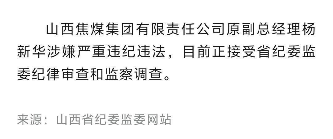 山西焦煤集团有限责任公司原副总经理杨新华涉嫌严重违纪违法,目前正接受省纪委监委纪律审查和监察调查。